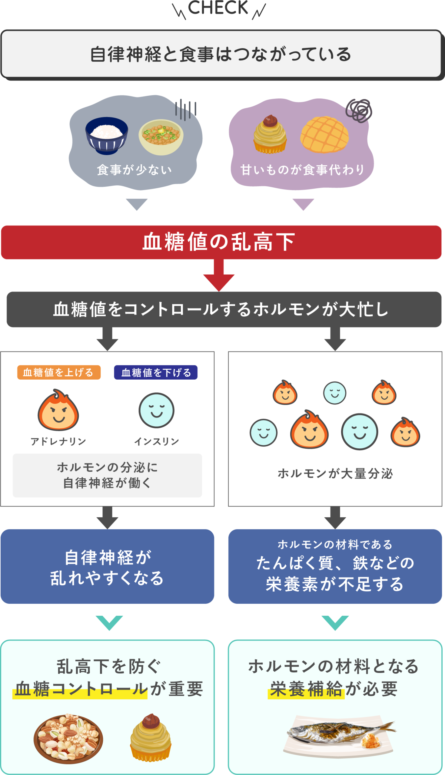 イライラ、ダルさなどの「なんとなく不調」と栄養の関係を学びます。栄養状態の改善には「順序」が大切です。